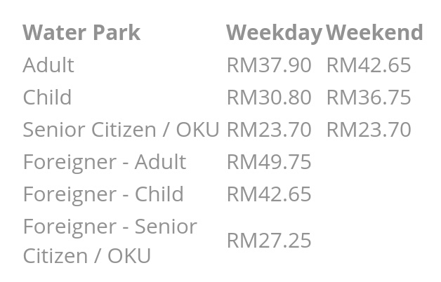 Selain itu, tiket dikenakan kepada kanak-kanak yang mempunyai ketinggian melebihi 90 cm hingga 12 tahun, manakala bagi kanak-kanak mempunyai ketinggian 3 kaki ke bawah adalah percuma.